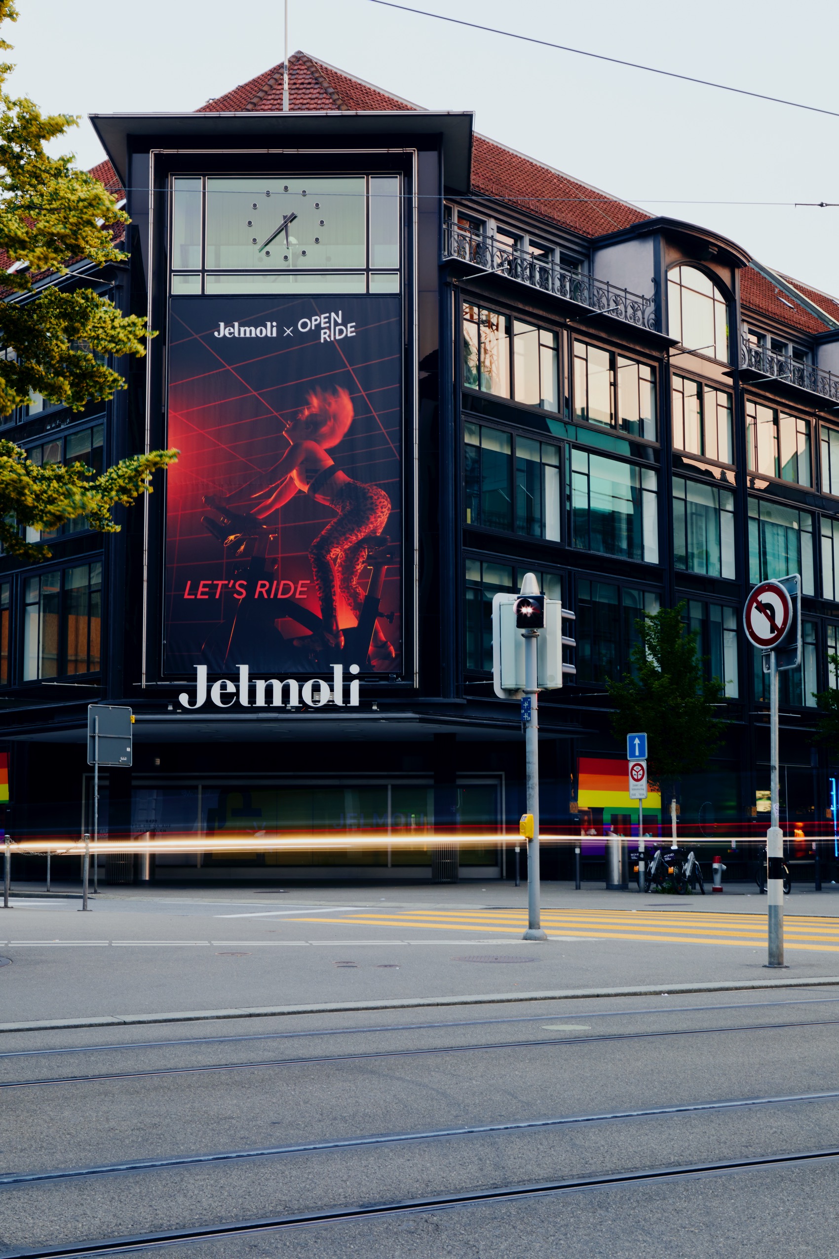 OPENRIDE x JELMOLI COLLABORATION: EYENEX hat Ende Juni 2021 den Schuss fürs Fassadenplakat über dem Jelmoli-Eingang geliefert. Das Bild im Weltformat war neun Meter hoch und strahlte eine Woche lang auf die Zürcher Bahnhofstrasse.
